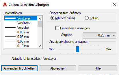 Legt die Linienstärke VORGABE für Layer fest. (Systemvariable LWDEFAULT)