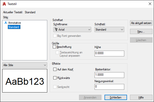 Bestimmt die Schriftformatierung (beispielsweise kursiv, fett oder normal). Wenn das Kontrollkästchen Big Font verwenden aktiviert ist, ändert sich der Optionsname zu Big Font und kann nun zur Auswahl eines Big Font-Dateinamens eingesetzt werden.