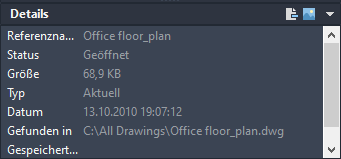 Wenn der Detailsmodus aktiviert ist, werde Eigenschaften für die ausgewählte Dateireferenz angezeigt. Jede Dateireferenz verfügt über einen Kernsatz an Eigenschaften und einige Dateireferenzen, beispielsweise referenzierte Bilder und jeweils für den Dateityp gültige Anzeigeeigenschaften. Zum Kernsatz der Details gehören Name, Status, Dateigröße, Dateityp, Erstellungsdatum, gespeicherter Pfad, gefundener Pfad und Dateiversion der Referenz, falls der Autodesk Vault-Client installiert ist (nicht verfügbar in AutoCAD LT). Einige der Eigenschaften können bearbeitet werden.