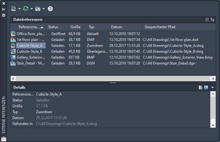 Zeigt eine Liste der Referenzen in der aktuellen Zeichnung an, einschließlich Informationen wie Status, Größe und Erstellungsdatum.
