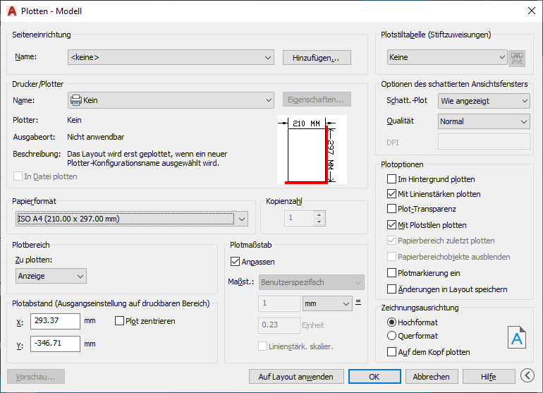 Zur Festlegung der Einstellungen für Gerät und Ausgabemedium sowie zum Plotten der Zeichnung.