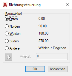 Legt die Richtung des Nullwinkels fest. Diese folgenden Optionen beeinflussen die Eingabe von Winkeln, das Anzeigeformat sowie die Eingabe von Polar-, Zylinder- und Kugelkoordinaten.