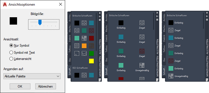 - Ansichtsoptionen. Ändert den Anzeigestil und die Größe der Symbole in einer Werkzeugpalette.