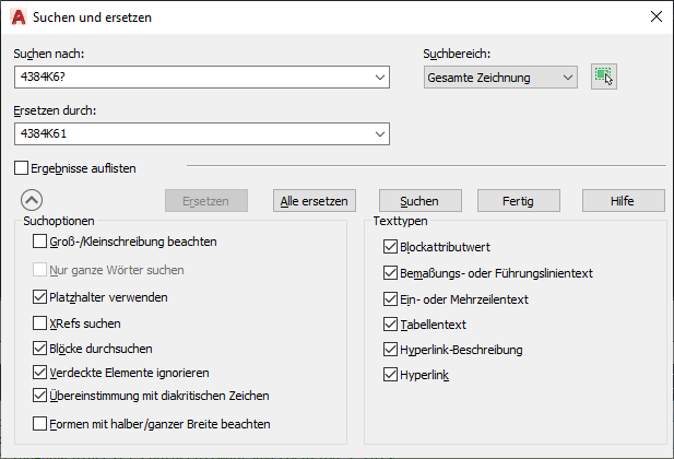 Beispiel: Ihre Zeichnung enthält mehrere ähnliche Bauteile. Wenn Sie sie aber alle in 4384K61 ändern möchten, geben Sie 4384K6? im Feld Suchen nach und 4384k61 im Feld Ersetzen durch ein.