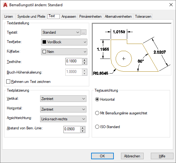 Wenn der auf dieser Registerkarte angegebene Textstil über eine feste Texthöhe verfügt, überschreibt dieser Wert die hier festgelegte Texthöhe. Wenn Sie die Höhe für den Maßtext hier festlegen möchten, stellen Sie sicher, dass die Höhe des Textstils auf 0 gesetzt ist. Weitere Informationen zum Festlegen der Texthöhe für Textstile finden Sie unter dem Befehl STIL.