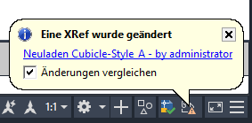 Wenn sich eine referenzierte Datei geändert hat, wird in der rechten unteren Ecke des Anwendungsfensters (im Spezialfeld der Statusleiste) neben dem XRef-Symbol standardmäßig eine Meldung eingeblendet. Klicken Sie auf die Verknüpfung in der Sprechblase, um die geänderten XRefs neu zu laden.