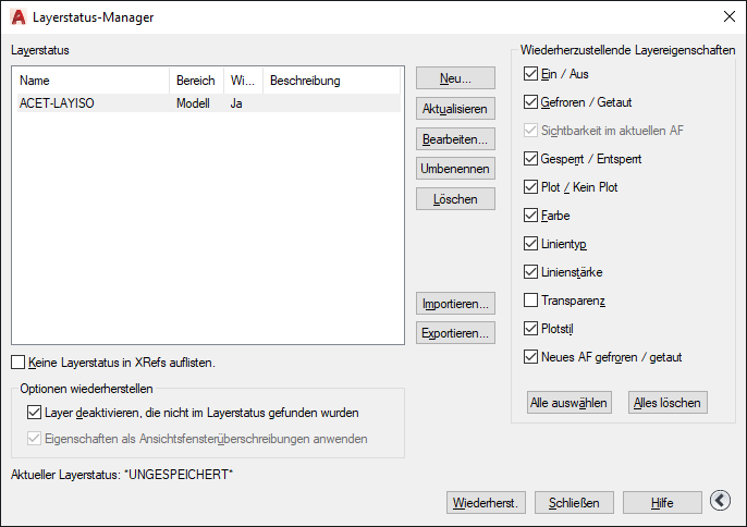 Listet die Layerstatus auf, die in der Zeichnung gespeichert wurden.