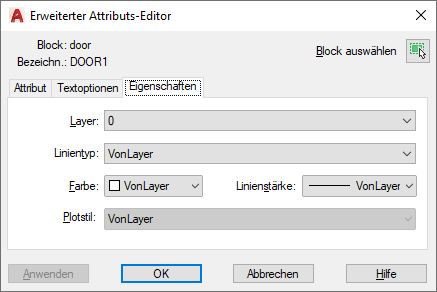 Definiert den Layer, auf dem sich das Attribut befindet, sowie die Linienstärke, den Linientyp und die Farbe für den Attributtext. Wenn die Zeichnung Plotstile verwendet, können Sie dem Attribut auf der Registerkarte Eigenschaften einen Plotstil zuweisen.