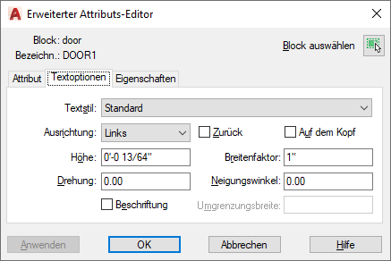 Bestimmt die Eigenschaften, die festlegen, wie ein Attributtext in der Zeichnung angezeigt wird. Die Farbe des Attributtextes können Sie auf der Registerkarte Eigenschaften ändern.