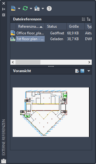 Sie können dateispezifische Informationen über die Unterlagen, die einer Zeichnung zugeordnet sind, in der Palette Externe Referenzen anzeigen. Sie können Unterlagen auch laden und entfernen sowie andere Vorgänge ausführen.