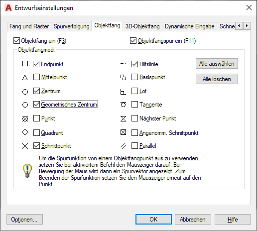 Steuert die aktuellen Einstellungen für den Objektfang.