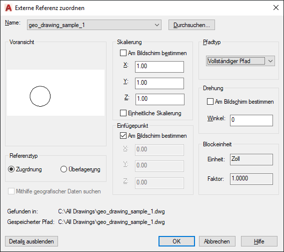 Wählen Sie den vollen (absoluten) Pfad, den relativen Pfad zur Datei der externen Referenz oder Kein Pfad sowie den Namen der Bilddatei aus (die Bilddatei muss sich in demselben Ordner wie die aktuelle Zeichnungsdatei befinden).