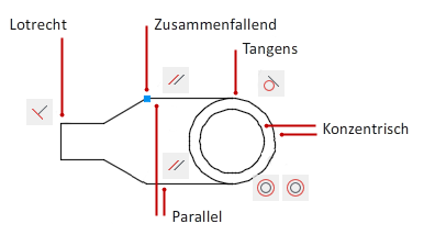 Beispielsweise können Sie festlegen, dass eine bestimmte Linie stets lotrecht zu einer anderen Linie liegt, dass ein Bogen und ein Kreis immer konzentrisch zueinander bleiben oder dass eine Linie stets tangential zu einem Bogen ist.