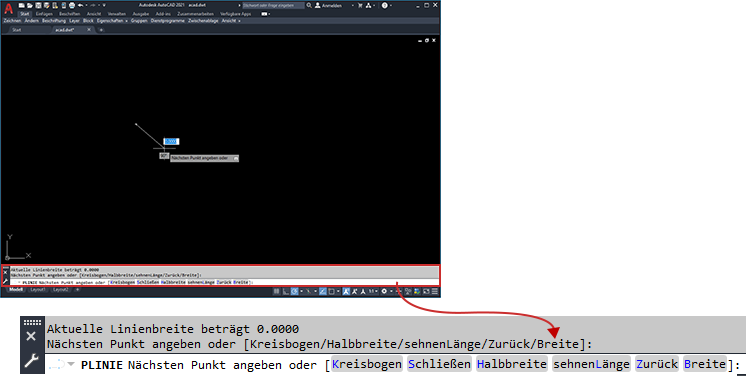 Ein fixiertes Befehlsfenster hat dieselbe Breite wie das Anwendungsfenster. Es wird an einer festen Position oberhalb oder unterhalb des Zeichenbereichs angezeigt.