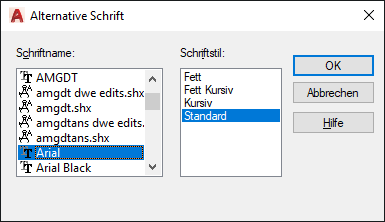 Wenn Sie keine alternative Schrift bestimmen, wird beim Öffnen von Zeichnungen, die nicht aufgefundene Schriften enthalten, ein Dialogfeld angezeigt, in dem Sie jeweils eine Schrift als Ersatz für die fehlenden Schriften festlegen können.