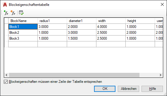 Im Dialogfeld Blockeigenschaftentabelle sind die Spaltenüberschriften Parameter, während die Zeilen die Eigenschaftensatzwerte definieren. Eine ausgewählte Blockreferenz kann auf die definierten Werte eingestellt werden. Jede Blockdefinition kann eine Tabelle enthalten.