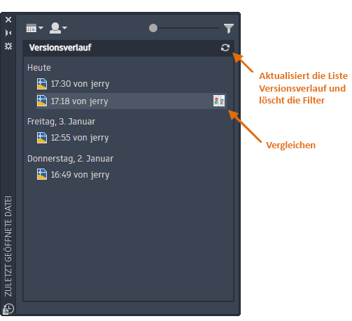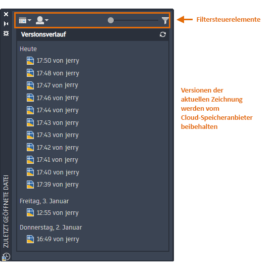 In der Palette Zuletzt geöffnete Datei werden die Versionen der Zeichnungen, die Sie in OneDrive, Dropbox oder Box speichern, angezeigt. Jedes Mal, wenn Sie eine Zeichnung speichern, die in Ihrem Konto bei einem Cloud-Speicheranbieter gespeichert ist, wird eine Vorgängerversion erstellt und verwaltet, falls Sie diese mit der aktuellen Version Ihrer Zeichnung vergleichen möchten. Diese Vorgängerversionen bilden den Versionsverlauf der Zeichnung.