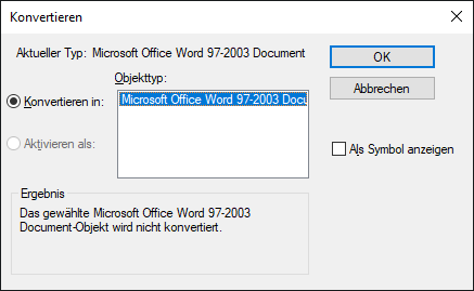 Konvertiert das eingebettete Objekt in den unter Objekttyp angegebenen Typ.