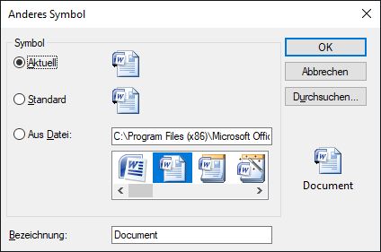 Legt eine Bezeichnung für das Symbol fest. Sofern Sie keine andere Bezeichnung angeben, wird standardmäßig der Dateiname angezeigt.