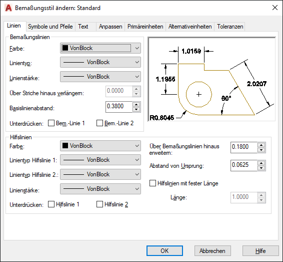 Zur Bestimmung des Formats und der Eigenschaften von Maßlinien, Hilfslinien, Pfeilspitzen und Zentrumsmarken.