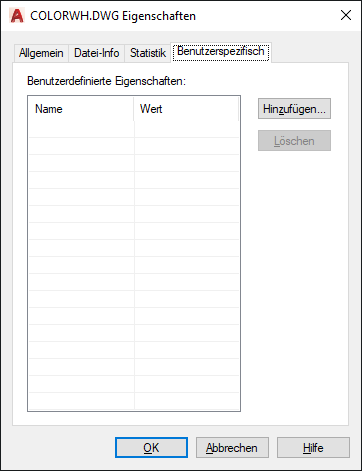 Führt die Namen und die Werte der benutzerspezifischen Eigenschaften in der aktuellen Zeichnung auf.