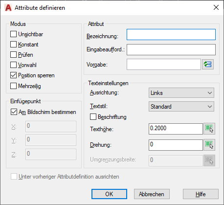 Die Vorgabewerte werden in der Systemvariable AFLAGS gespeichert. Eine Änderung der Einstellungen für AFLAGS wirkt sich auf den Vorgabemodus für neue Attributdefinitionen aus und nicht auf vorhandene Attributdefinitionen.