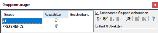 Ist eine Gruppe nicht wählbar, ist das Glühlampensymbol deaktiviert. Bei Auswahl eines einzelnen Gruppenelements wird dann nur dieses Objekt ausgewählt. Wenn die Systemvariable PICKSTYLE auf 0 gesetzt ist, können keine Gruppen ausgewählt werden.