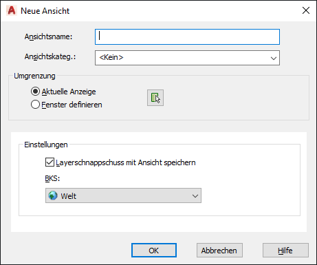 Speichert eine neue benannte Ansicht aus der Anzeige im aktuellen Ansichtsfenster oder durch Definition eines rechteckigen Fensters.