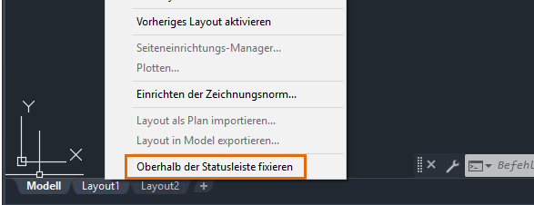 Klicken Sie mit der rechten Maustaste auf die Registerkarte Modell oder Layout, und wählen Sie Oberhalb der Statusleiste fixieren oder Auf gleicher Höhe wie Statusleiste fixieren.