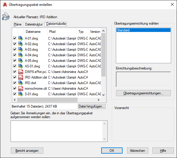 Zeigt Berichtsdaten an, die Bestandteil des Übertragungspakets sind. Dazu gehören alle Übertragungshinweise, die Sie eingegeben haben, sowie alle automatisch erstellten Verteilungshinweise. In den Verteilungshinweisen werden die Schritte beschrieben, die für eine korrekte Funktionsweise des Übertragungspakets durchgeführt werden müssen. Beispiel: Wenn eine Übertragungszeichnung SHX-Schriften enthält, wird angegeben, wohin Sie die Dateien kopieren müssen, damit diese in dem System, auf dem das Übertragungspaket installiert wird, erkannt werden. Wenn Sie eine Textdatei mit Vorgabeanmerkungen erstellt haben, werden diese Anmerkungen ebenfalls in den Bericht einbezogen.