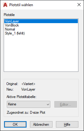 Zeigt die verfügbaren Plotstile an, einschließlich des Standardplotstils NORMAL. Ein Plotstil besteht aus einer Sammlung von Eigenschaften, die beim Plotten angewendet werden.