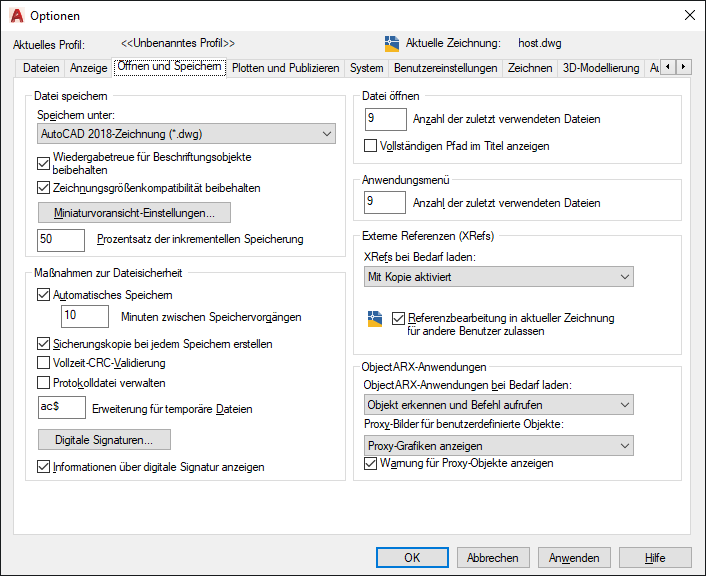 Minuten zwischen Speichervorgängen: Legt fest, wie oft die Zeichnung gespeichert wird, wenn das automatische Speichern aktiviert ist. (Systemvariable SAVETIME)
