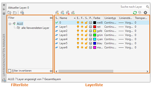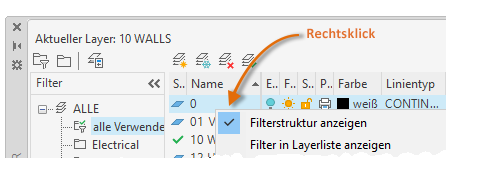 Zeigt eine Liste der Layerfilter für die Zeichnung an. Klicken Sie auf