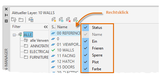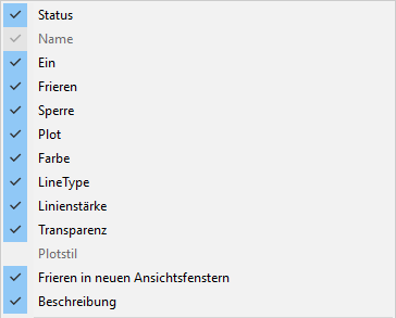 Führt die Namen aller Spalten auf. Ein Häkchen gibt an, dass die Spalte angezeigt wird. Klicken Sie zum Anzeigen oder Ausblenden der Spalte auf einen Spaltennamen. AF Frieren, AF Farbe, AF Linientyp, AF Linienstärke und AF Plotstil sind nur verfügbar, wenn ein Layout-Ansichtsfenster aktiv ist.