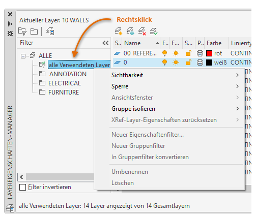 Entfernt den ausgewählten Layerfilter. Die Layerfilter Alle, Alle verwendeten Layer und XRef können nicht gelöscht werden.