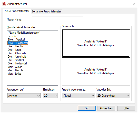 Bestimmt einen Namen für die neu Konfiguration für Ansichtsfenster im Modellbereich. Wenn Sie keinen Namen eingeben, wird die Ansichtsfensterkonfiguration zwar angewandt, jedoch nicht gespeichert. Eine nicht gespeicherte Ansichtsfensterkonfiguration kann nicht für Layouts verwendet werden.