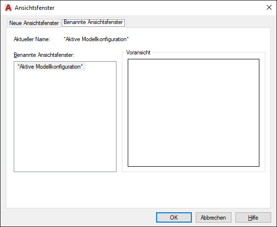 Zeigt alle gespeicherten und benannten Konfigurationen für Ansichtsfenster im Modellbereich an, die im aktuellen Layout zur Verfügung stehen. Layout-Ansichtsfensterkonfigurationen können weder gespeichert noch benannt werden.