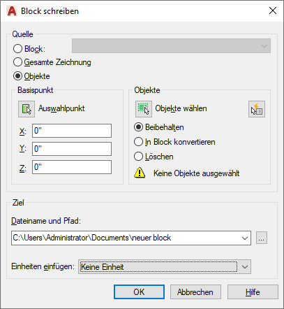 Wählt Objekte aus, um sie als Datei zu speichern. Legen Sie einen Basispunkt fest, und wählen Sie unten Objekte aus.