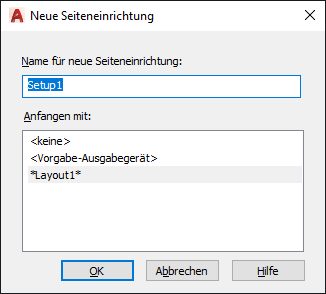 Legt einen Namen für die neue Seiteneinrichtung fest und gibt an, welche Seiteneinrichtung als Ausgangspunkt verwendet werden soll.