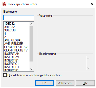 Speichert die Blockdefinition als Zeichnungsdatei. Wenn dazu eine bereits bestehende Zeichnungsdatei ausgewählt wird, wird diese überschrieben. Standardmäßig wird der angegebene Blockname als Name der Zeichnungsdatei verwendet.
