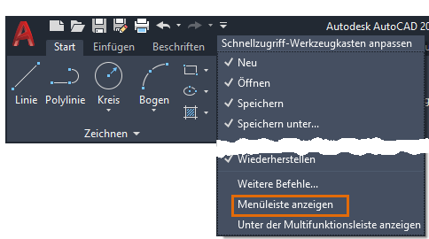 Die Menüleiste kann über die Dropdown-Liste des Schnellzugriffs-Werkzeugkastens oder durch Anpassen der Benutzeroberfläche mit dem Befehl ABI aktiviert werden.