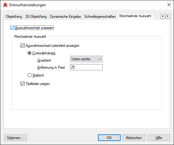 Steuert, ob die Funktion zum Wechseln der Auswahl aktiviert ist. (Systemvariable SELECTIONCYCLING)