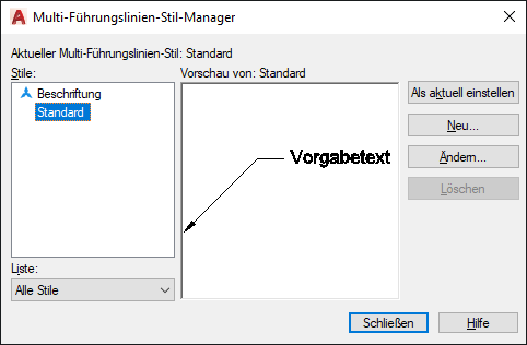 Legt den in der Liste Stile ausgewählten Stil als aktuellen Stil fest. Alle neuen Multi-Führungslinien werden mit diesem Stil erstellt.