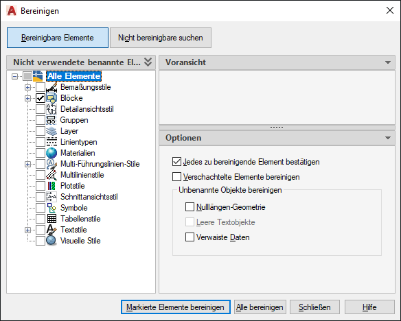Entfernt nicht verwendete Elemente wie Blockdefinitionen und Layer aus der Zeichnung. Zeigt Elemente an, die bereinigt werden können, und sucht Objekte in der Zeichnung, die nicht bereinigt werden können.