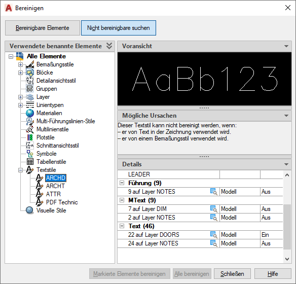 Die meisten dieser Objekte werden derzeit in der aktuellen Zeichnung verwendet oder sind Standardelemente, die nicht entfernt werden können. Wenn Sie einzelne benannte Objekte auswählen, wird angezeigt, warum das Element nicht bereinigt werden kann.