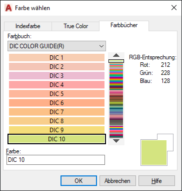 Auf der Registerkarte Farbbücher wird der Name des ausgewählten Farbbuchs angezeigt.