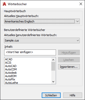 Zeigt den Namen des aktuellen Benutzerwörterbuchs an. Die Erweiterungcus wird für AutoCAD-Benutzerwörterbücher verwendet.