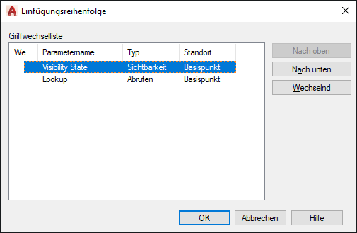 Listet die Griffe in der dynamischen Blockdefinition auf. Ein Häkchen in der Spalte Wechselnd weist darauf hin, dass für diesen Griff ein Wechsel aktiviert ist.