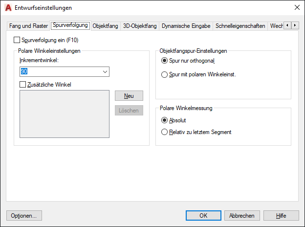 Wendet die Spurverfolgungseinstellungen in Objektfangspuren an. Wenn Sie Objektfangspuren verwenden, verfolgt der Cursor die Spur entlang der Ausrichtungswinkel von aufgerufenen Objektfangpunkten. (Systemvariable POLARMODE)