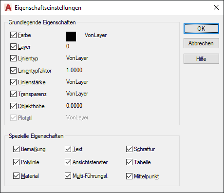 Ändert zusätzlich zu den grundlegenden Objekteigenschaften die Schraffureigenschaften (einschließlich der Beschriftungseigenschaften) des Zielobjekts in die des Quellobjekts. Um den Schraffurursprung abzustimmen, verwenden Sie Eigenschaften anpassen in SCHRAFF oder SCHRAFFEDIT. Nur für Schraffurobjekte.
